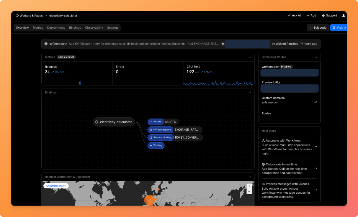 I built syfatora.com — a Syrian utility bill calculator that handles electricity, water, fuel, currency exchange, and more. 93% of traffic is mobile, Arabic-first, and reliability is critical since users depend on it for real bill calculations. Here's the Cloudflare architecture that runs the whole thing: